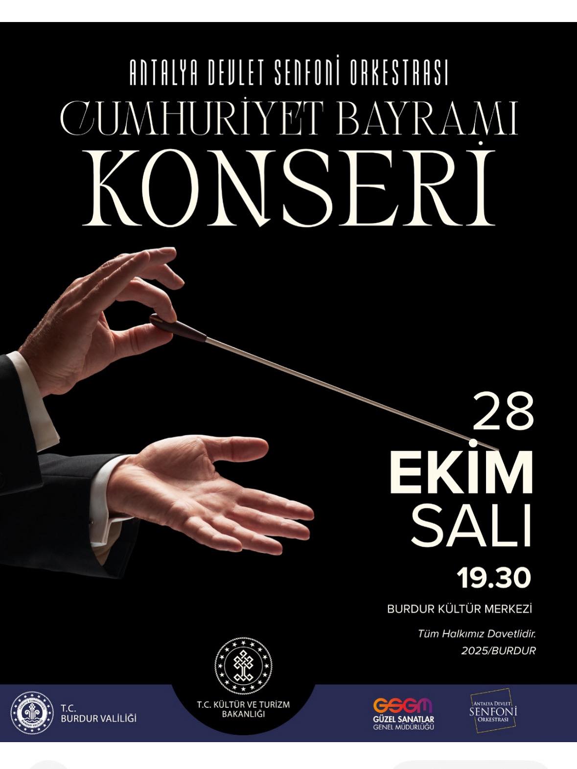 Antalya Devlet Senfoni Orkestrası, 28 Ekim 2025 Salı günü saat 19:30’da Burdur Kültür Merkezi’nde vereceği özel bir konserle Burdur halkıyla buluşacak.Türkiye Cumhuriyeti'nin kuruluşunun coşkusu, Burdur’da görkemli bir sanat etkinliği ile kutlanacak. Burdur Valiliği ve T.C. Kültür ve Turizm Bakanlığı’nın katkılarıyla, Antalya Devlet Senfoni Orkestrası (ADSO), Burdur halkı için özel bir Cumhuriyet Bayramı Konseri verecek. Konser Detayları: Tarih ve SaatSanatseverlerin büyük bir heyecanla beklediği konser, 28 Ekim 2025 Salı akşamı gerçekleştirilecek. Etkinlik saati 19:30 olarak belirlenirken, konser için buluşma adresi ise Burdur Kültür Merkezi olacak. Antalya Devlet Senfoni Orkestrası’nın milli duyguları yükseltecek özel repertuvarı ile sahne alacağı bu anlamlı geceye, posterde yer alan duyuruya göre tüm Burdur halkı davetlidir. |