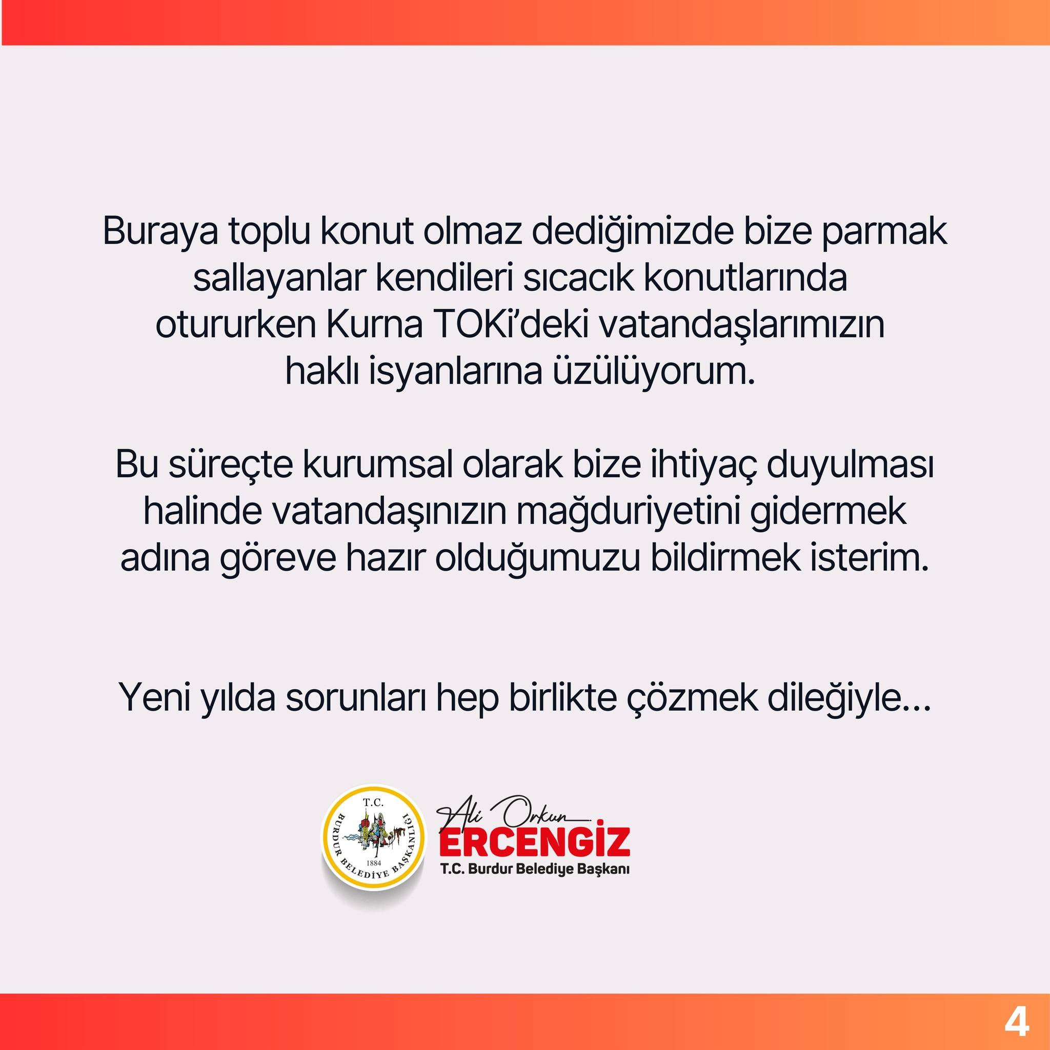"Göreve Hazırız" MesajıVatandaşların haklı isyanlarına üzüldüğünü belirten Başkan Ercengiz, "Kendileri sıcacık konutlarında otururken Kurna TOKİ'deki vatandaşlarımıza parmak sallayanların aksine, biz kurumsal olarak her türlü yardıma hazırız" dedi. Ercengiz, yeni yılda sorunları ortak akılla çözme temennisinde bulunarak sözlerini tamamladı. |